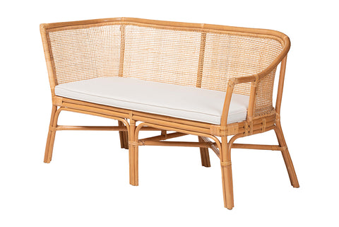 bali & pari Aara 3-Piece Natural Rattan Dining Nook Set - L-Shaped Corner Bench with Cushions and Round Pedestal Wicker Table, Handwoven Boho Coastal Breakfast Banquette for Kitchen or Sunroom
