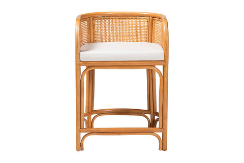 The balanced comfort and rustic splendor of the Aria counter stool refreshes any home bar or lounge. Made in Indonesia, this bohemian piece is handcrafted from sustainably sourced natural rattan. The rattan pole forming its silhouette features smooth, flowing geometric allure while highlighting the meticulously woven rattan embellishments of the backrest. The Aria will arrive fully assembled and is fitted with a removable seat cushion padded with plush foam and upholstered in soft fabric. With an ergonomic footrest, the Aria counter stool is a chic and cozy addition to any setting. Disclaimer: Rattan is a product of nature and may have variations in areas such as, but not limited to, color, pattern, grain and texture. The hair-like strands of rattan/rattan-fiber are common due to the nature of the material. Features: Handwoven Rounded Backrest - The arms and backrest feature woven detailing for a breezy, tropical aesthetic, Durable Construction - Entirely handcrafted from Natural Rattan, Padded Seat Cushion - Removable seat cushion upholstered in cozy fabric adds extra comfort, Integrated Footrest - The ergonomic footrest provides added comfort and structural stability, Boho-Coastal Aesthetic - Grants a natural, relaxed look perfect for any lounge or dining space, Comes Fully Assembled - This counter stool arrives ready for use Overall Chair Dimensions: 22.00" W x 20.50" D x 31.90" H; Seating: 19.70" W x 19.30" D x 22.40" H(from floor); Backrest(from seat up): 9.50"; Clearance(floor to bottom of seat): 22.10" H; Clearance(floor to lowest stretcher): 3.90" H; One (1) Counter Stool. Weight: 12,6 lbs.