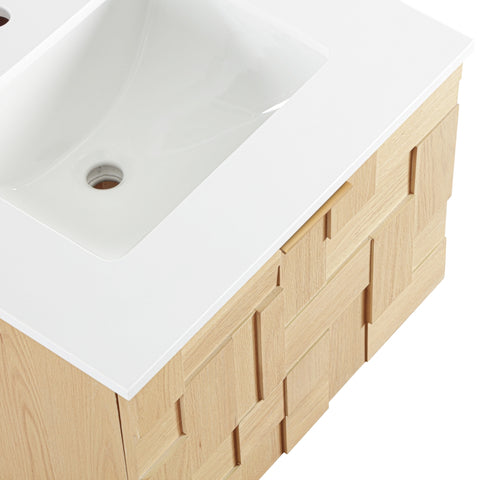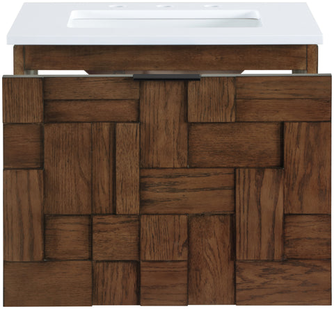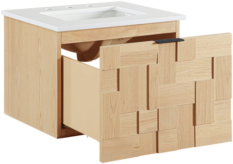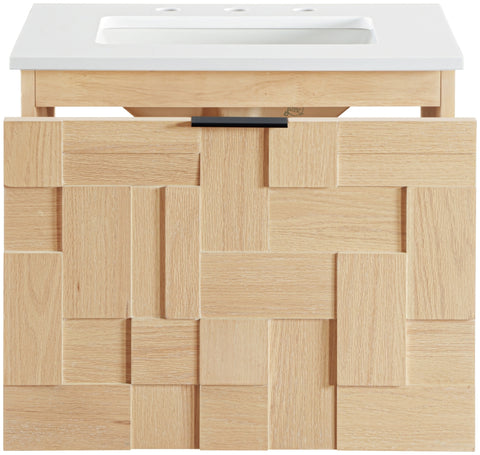 Natural wood and a striking geometric design make the Leonardo bathroom vanity a standout in any space. Topped with a sleek white engineered stone surface, it's a chic blend of function and modern style. Customize the look with your choice of brushed gold, chrome, or matte black handles, all included for a tailored finish.