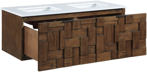 Rich brown walnut wood and a striking geometric design make the Leonardo bathroom vanity a standout in any space. Topped with a sleek white engineered stone surface, it's a chic blend of function and modern style. Customize the look with your choice of brushed gold, chrome, or matte black handles, all included for a tailored finish.