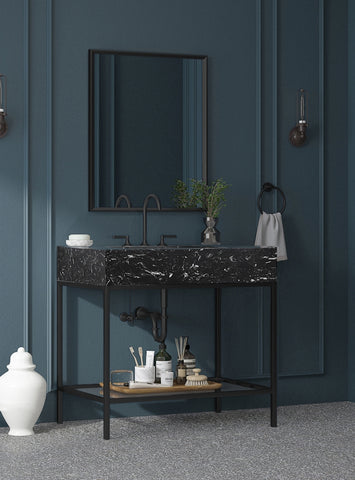 Give your bathroom a fresh new look with this Marmo 36-inch bathroom vanity. This eye-grabbing vanity gives your restroom a spa vibe that's oozing contemporary charm and sophistication. The black engineered stone sink features white veining for an upscale presentation and rests on a matte black-finish stainless steel base for long-lasting beauty and performance. Ceramic construction ensures durability, so you can count on this 36-inch sink lasting for the long haul.