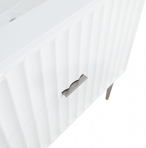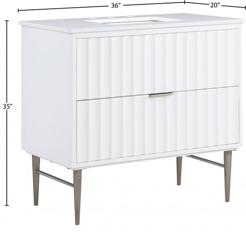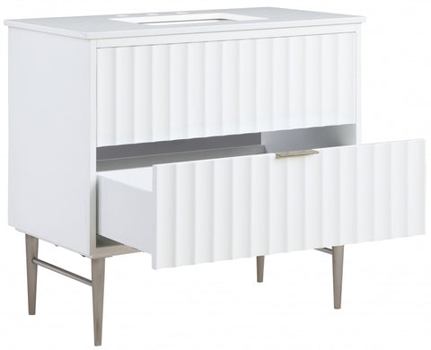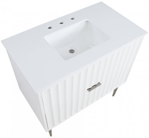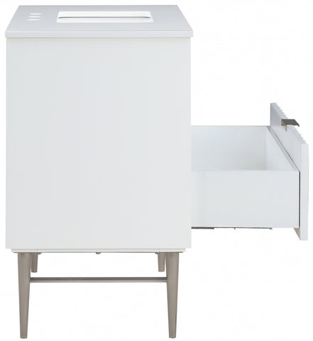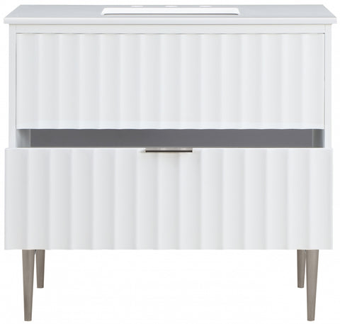 Your bathroom gets a revamp with this Modernist 36-inch bathroom vanity. This lovely vanity is a must for the contemporary bathroom space and features a rich white finish in brushed chrome for lasting beauty and performance. Made from solid wood and wood products, this vanity has a pretty Engineered Stone top for enduring good looks. Store bathroom essentials in its two drawers to keep your bathroom tidily organized.