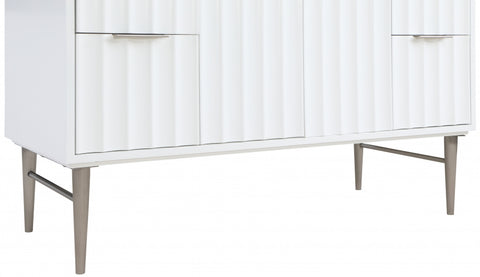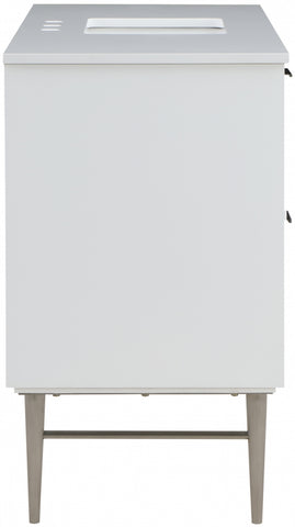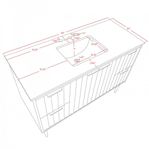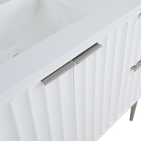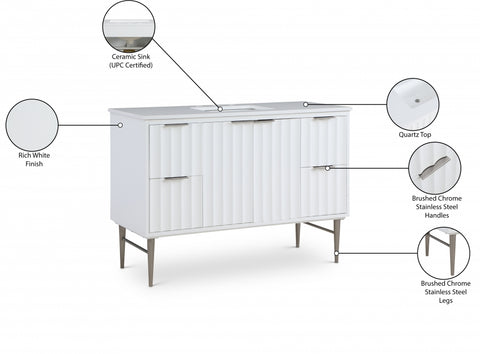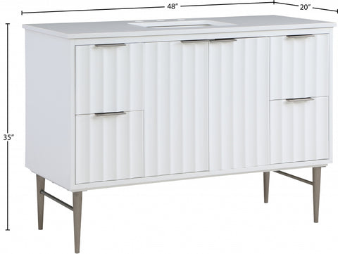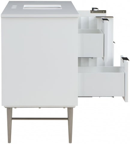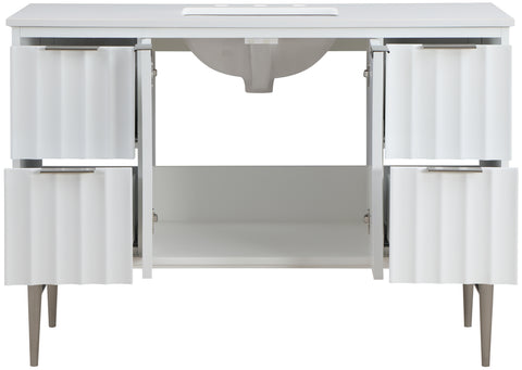 Your bathroom gets a revamp with this Modernist 48-inch bathroom vanity. This lovely vanity is a must for the contemporary bathroom space and features a rich white finish in brushed chrome for lasting beauty and performance. Made from solid wood and wood products, this vanity has a pretty Engineered Stone top for enduring good looks. Store bathroom essentials in its two drawers to keep your bathroom tidily organized.