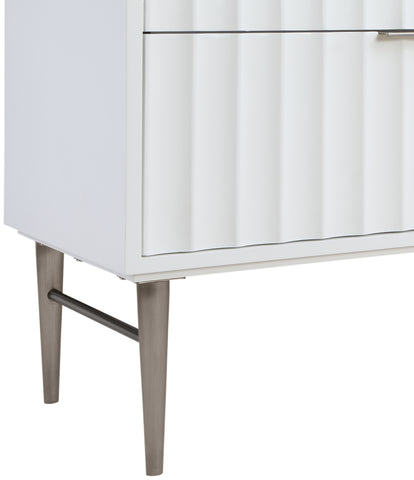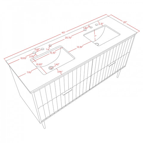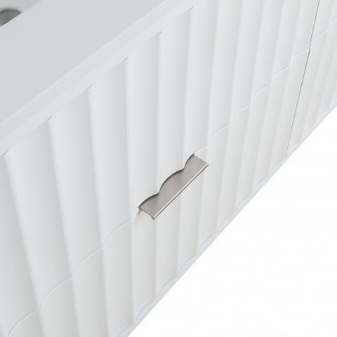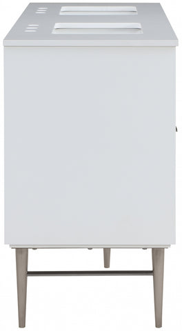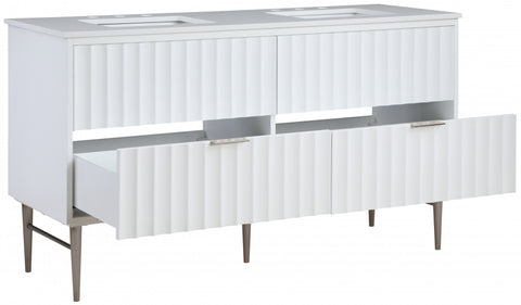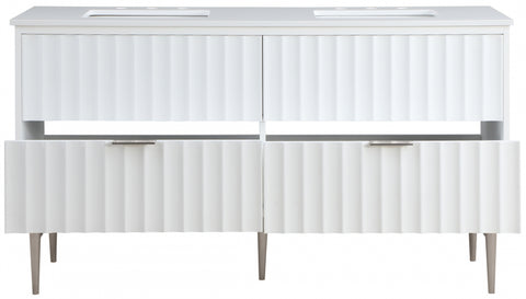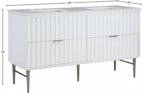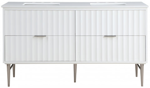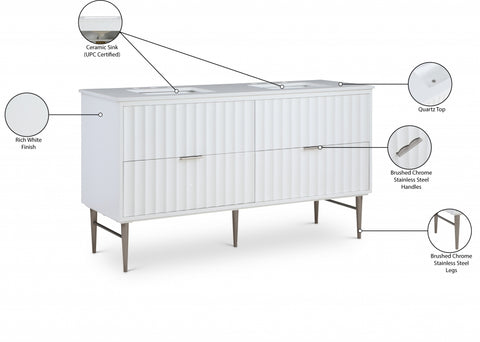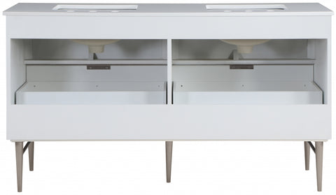 Your bathroom gets a revamp with this Modernist 60-inch bathroom vanity. This lovely vanity is a must for the contemporary bathroom space and features a rich white finish in brushed chrome for lasting beauty and performance. Made from solid wood and wood products, this vanity has a pretty Engineered Stone top for enduring good looks. Store bathroom essentials in its two drawers to keep your bathroom tidily organized.