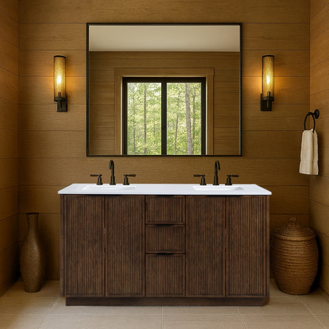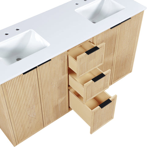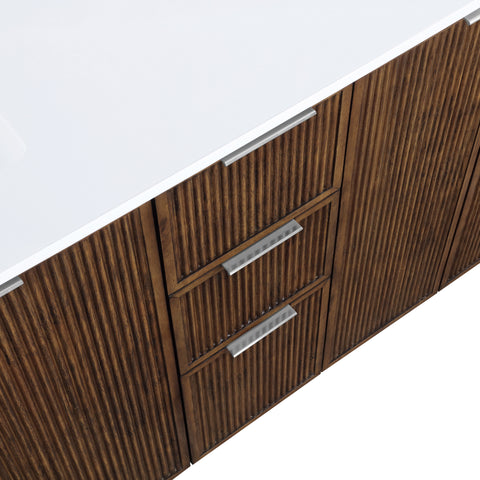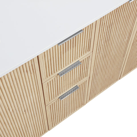 Textured natural wood and a sleek white engineered stone top bring contemporary style to the Willard bathroom vanity. Complete with a full set of brushed gold, chrome, and matte black handles, it's designed for a personalized finish. Spacious drawers provide ample storage, making it a stylish and functional addition to any bathroom.