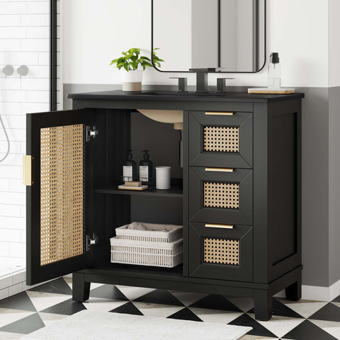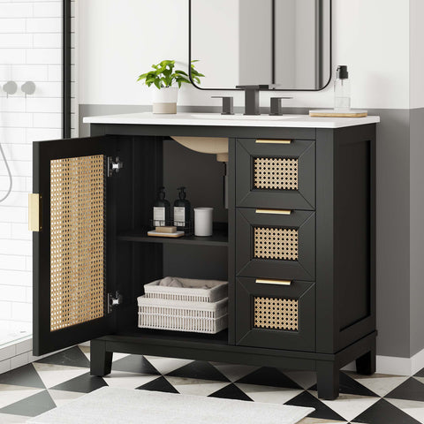 With its clean lines, smooth surfaces, and contemporary angles, the Dixie 36" Bathroom Vanity introduces a layer of modern sophistication to any bathroom space. Crafted from solid Mahogany wood, it stands firm on slightly tapered legs and is fitted with a sleek ceramic basin boasting an integrated countertop and 8-inch widespread faucet holes. This vanity features one cabinet door, concealing a height-adjustable shelf with a cut-out design to accommodate plumbing, and three adjacent drawers, enhancing functionality and storage space. All compartments are tastefully adorned with satin brass handles and equipped with soft close hinges, for a smooth experience. Optimizing storage for a variety of bathroom essentials, from towels to toiletries, the Dixie Bathroom Vanity ensures that everything is conveniently at hand. It includes non-marking foot caps for floor protection. Sink basin and fixtures not included. Assembly required. Weight Capacity: 200 lbs Features: Solid Mahogany Wood, Ceramic Sink Basin, Open Weave Rattan Detail, Satin Brass Handles, Soft-close Hinges, Fixtures Not Included, Assembly Required Overall Product Dimensions: 18"L x 36"W x 41"H, Drawer Frame Dimensions: 12"L x 10"W x 8.5"H, Inner Drawer Dimension: 11"L x 11"W, Base Dimensions: 17.5"L x 34.5"W . Set Includes: One - 36" Vanity Cabinet, One - Cayman 36" Bathroom Sink