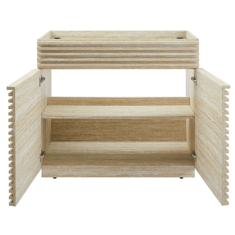 Tap into mid-century aesthetics with the Render 36 Inch Bathroom Vanity Cabinet. This slatted bathroom cabinet features a durable particleboard frame with faux travertine laminate and a sturdy plinth base. It includes an adjustable shelf behind two soft-close hinged doors, providing ample room for plumbing and storage. Designed to be paired with a sink basin and fixtures of your choice, this bathroom vanity with no sink is ready to complete your bathroom with your personal touch. Boasting a mid-century modern style, the Render bathroom vanity offers a solid construction with a pleasing look and practical functionality. Assembly required. Vanity bathroom sink and fixtures are not included. Features: Bathroom Vanity Cabinet, Slatted Soft-Close Doors, Adjustable Storage Shelf Overall Product Dimensions: 18.2"L x 34.9"W x 32.7"H, Floor to Underside of Table: 2.5"H . Set Includes: One - Render 36" Bathroom Vanity Cabinet (Sink Not Included)