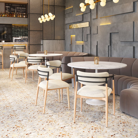 With its Oyster Gray & Natural finish and premium textured 100% polyester fabric, powder coated steel, and faux wood steel construction, the Equinox Dining Chair is the epitome of modern design. Ideal for hospitality use, it makes a fitting addition to any space. Features: Assembly not required, Armrest support, Faux wood steel leg, Rubber feet help prevent floor scratches, Supports up to 330 lb. Dimensions: 23" W x 21.7" D x 30.1" H. Weight: 18,7 lbs.