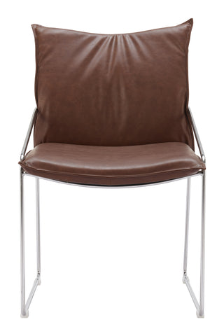 A statement of modern elegance designed for hospitality settings, the Pola Dining Chair Brown features brown hues and a sleek structure crafted from faux leather (100% polyurethane), plywood and chromed steel, ensuring both style and longevity. Features: Assembly required, Plush and durable faux leather fabric, Armrest support, Chromed steel leg, Rubber feet help prevent floor scratches, Supports up to 440 lb. Dimensions: 19.7" W x 23.6" D x 31.9" H. Weight: 19,8 lbs.