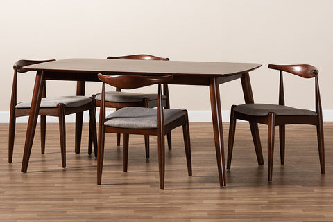 Baxton Studio Amato Mid-Century Modern Light Gray Fabric Upholstered Walnut Finished Wood 5-Piece Dining Set