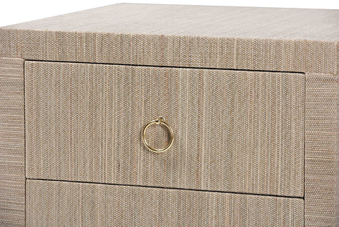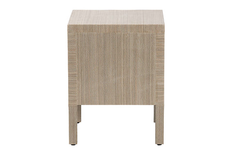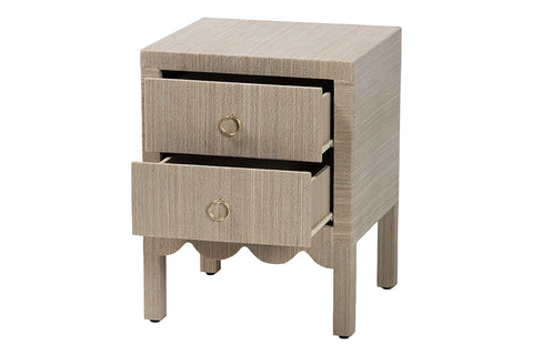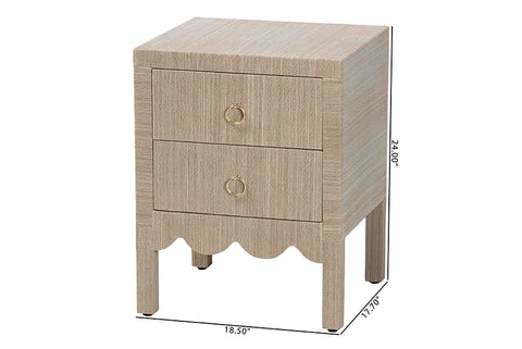 Bring chic refinement to your bedside with the lovely Juniper nightstand. Made in Indonesia, this bohemian piece consists of a sturdy wood frame intricately adorned with handwoven grasscloth. Two drawers offer storage for bedroom essentials while reserving the tabletop for nightly use. The Juniper will arrive fully assembled and is fitted with graceful metal ring pulls for a touch of luxury. With scalloped embellishments lending a vibrant display, the Juniper nightstand is sure refresh any bedroom layout. Disclaimer: Grasscloth is a product of nature and may have variations in areas such as, but not limited to, color, pattern, grain and texture. The hair-like strands of wicker/wicker-like fiber are common due to the nature of the material. Features: Handwoven Grasscloth : Intricately arranged grasscloth wraps the frame for a richly textured surface that brings coastal flair to any setting, Durable Construction : Constructed from Grasscloth and Engineered Wood, Bedside Storage : Two drawers provide secure storage space while reserving the tabletop as a versatile use area, Metal Ring Pulls : Elegant ring pulls add a glamorous touch while drawing attention to the rich texture of the piece, Scalloped Detailing : Scalloped edge framing adds visual interest rich with modern flair, Fully Assembled : This nightstand arrives ready for use Overall Nightstand Dimensions: 18.50" W x 17.70" D x 24.00" H; Drawer(s): 13.60" W x 13.60" D x 4.20" H; Clearance(floor to bottom drawer): 8.30"; Clearance(floor to scalloped edge): 6.00"; One (1) Nightstand. Weight: 37,6 lbs.