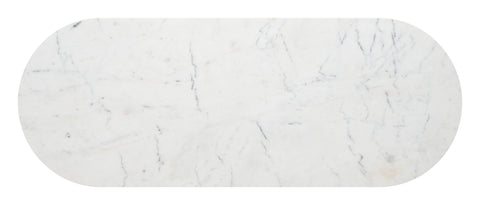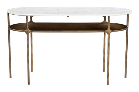 The Bild Console Table in White & Brass is a sophisticated addition to any contemporary living space. The marble top and iron frame combine to create a striking contrast between the white surface and brass accents. Ideal for entryways, living rooms, or hospitality settings, this console table offers both functionality and modern flair. Features: Assembly required, Natural Marble oval shape tabletop, Rubber feet help prevent floor scratches, Shelf: 48.7" W x 17.2" D x 6" H, Supports up to 35 lb. Dimensions: 50" W x 18.9" D x 28.3" H. Weight: 97,5 lbs.