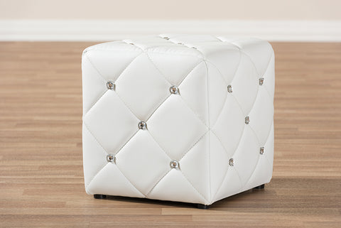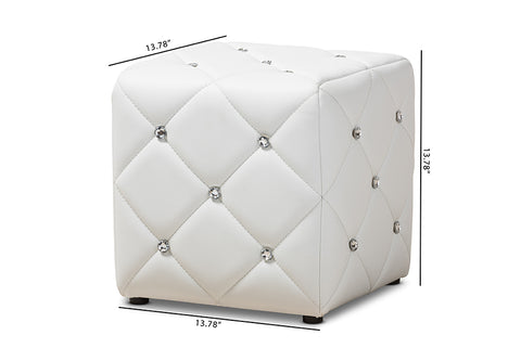 Add a touch of glam to your home with the Stacey ottoman. The solid and engineered wood construction makes this ottoman a sturdy yet compact addition to your livingroom, entryway, bedroom, or any shared space. The modern and contemporary-inspired Stacey features white faux leather upholstery and foam padding. The button-tufting with faux crystal details of this ottoman can give your space a little bit of the luxe and glam look to complete the style you want. The Stacey is chic, compact, and comes fully assembled. Made in China. Features: Modern and contemporary ottoman, White faux leather upholstery, Button tufted design, Faux crystal details, Foam padded, Comes fully assembled, Made in China, .One (1) Ottoman. Dimensions: 13.78" High x 13.78" Wide x 13.78" Deep; Seating Dimensions: 13.78" High (from Floor) x 13.78" Wide x 13.78" Deep; Legs: 0.39" High .Weight: 7,5lbs