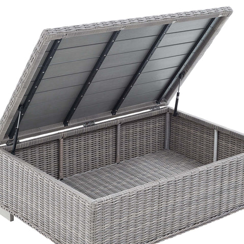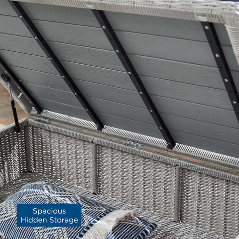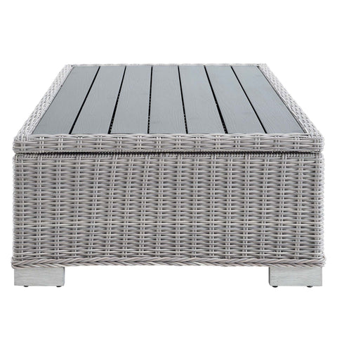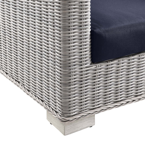 Enjoy fresh air and alfresco relaxation with the Conway Outdoor Patio Wicker Rattan 4-Piece Furniture Set. Wrapped in UV-resistant light gray synthetic wicker rattan, this patio furniture set boasts organic texture and a neutral hue that brings a calming presence to your outdoor space. The frames of this outdoor furniture set are crafted with durable powder-coated aluminum and rest on L-shaped legs with plastic foot glides. Thick foam padded cushions covered with removable, all-weather polyester fabric covers offer a comfortable seat and affix securely to the lounge chair with cord tension attachments. Trending aesthetics and a classic design define this outdoor patio furniture collection making it a beautiful addition to any outdoor space including the backyard, patio, porch, balcony, or poolside. Assembly required. Set Includes: Sofa, 2 Armchairs, Storage Coffee Table Features: 4-Piece Outdoor Patio Furniture Set, Water and UV Resistant, Light Gray Synthetic Rattan, Powder-Coated Aluminum Frame, All-Weather Cushion Covers, Non-Marking Foot Glides Overall Product Dimensions: 68"L x 150"W x 28"H, Overall 45" Coffee Table Dimensions: 31"L x 45"W x 15"H, Overall Armchair Dimensions: 36"L x 32"W x 28"H, Seat Dimensions: 22.5"L x 22"W x 15"H, Backrest Dimensions: 10"L x 22"W x 12"H, Armrest Dimensions: 22.5"L x 5"W x 6"H, Base Dimensions: 33.5"L x 31.5"W, Overall Sofa Dimensions: 36"L x 78"W x 28"H, Seat Dimensions: 22.5"L x 66"W x 15"H, Backrest Dimensions: 5"L x 66"W x 12"H, Armrest Height: 21"H, Cushion Thichkness: 5"H . Set Includes: One - Conway 45" Coffee Table, Two - Conway Armchair, One - Conway Sofa