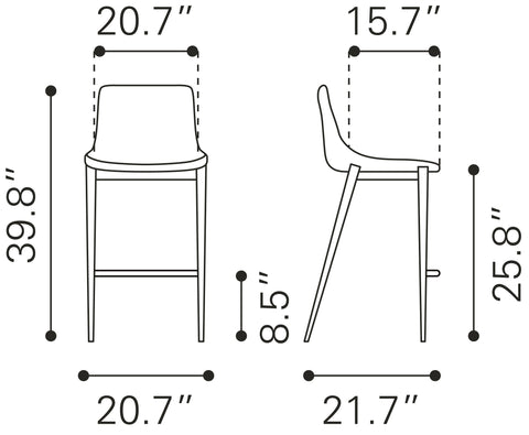 High design meets everyday casual. This handsome counter stool with its slim profile pulls up perfectly to the bar. Its super comfortable curved seat is covered in slate gray faux leather with dramatic stitching. Matte brown Faux Wood legs are complete with protective plastic feet to keep your floors scratch-free. Features: Assembly required, Plush and durable faux leather fabric, Ergonomic and supportive footrest, Faux wood steel leg, Rubber feet help prevent floor scratches, Stain and water resistant performance fabric, Supports up to 285 lb. Dimensions: 20.7" W x 21.7" D x 39.8" H. Weight: 15,8 lbs.