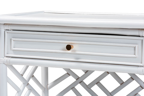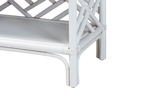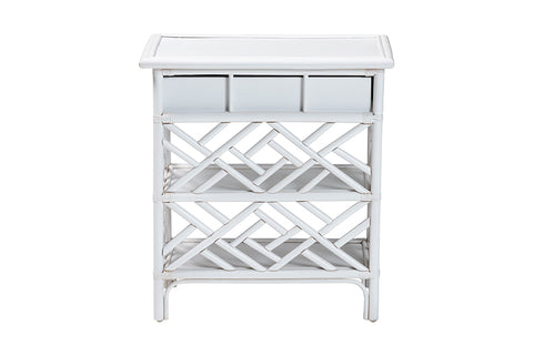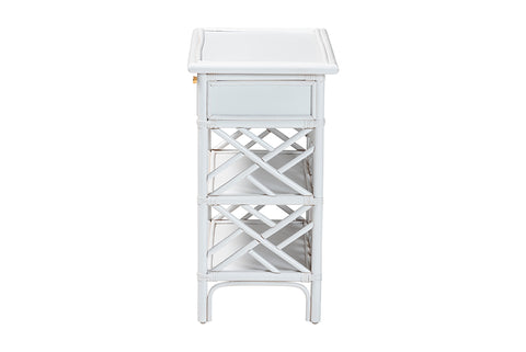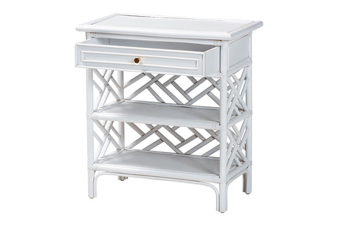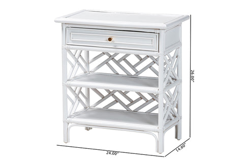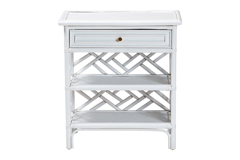 bali & pari Tiaret Natural Rattan Nightstand with Drawer and Shelves - Chippendale-Style Bedside Table for Bedroom or Coastal Living Spaces, White